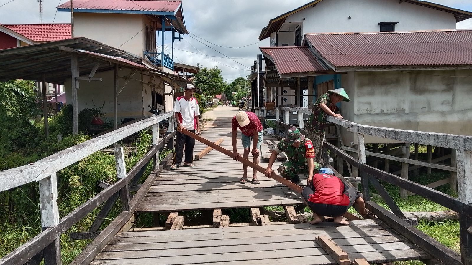 Babinsa Koramil 1206-11/Silat Hilir bersama masyarakat Dusun Mekar Jaya melaksanakan gotong royong memperbaiki jembatan desa pada Jumat (14/11/2025).
