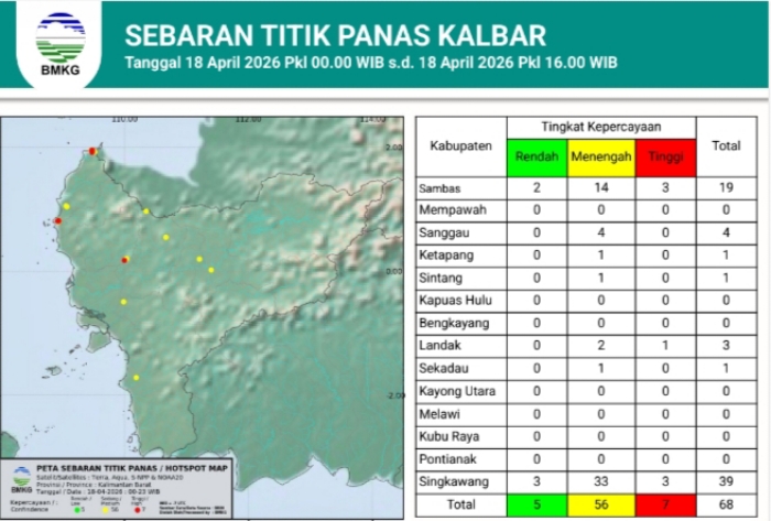 Di balik kondisi hujan yang cukup merata, satelit pengamat BMKG justru mencatat adanya 68 titik panas atau hotspot yang terdeteksi di seluruh daratan Kalimantan Barat pada pemantauan 18 April 2026.